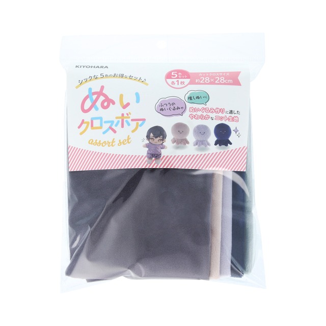 28cm×28cmサイズのぬいクロスボア5色入りのセットです。 いろんな色を少しずつ使いたいときに。 色違いで同じぬいぐるみを5個作るのも楽しいですね。 「ニュアンスカラー」のセットは、 落ち着いたトーンのグレー、ネイビー、パープル、グレージュ、グレイッシュパープル の計5色がセットになっています。 サイズ:幅約28cm×長さ約28cm ×5枚入り 素材:ポリエステル100% 原産国:中国 発売元:清原株式会社