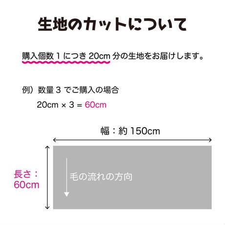・検品をしておりますが、輸入生地の性質上、国産の生地と比べると汚れや毛足の乱れが多少入る場合がありますのでご理解の上でご購入ください。汚れや毛足の乱れのある箇所が入る場合は、その部分を避けて使って頂けるように少し余分にカットしてお届けする場合がございます。あらかじめご了承ください。