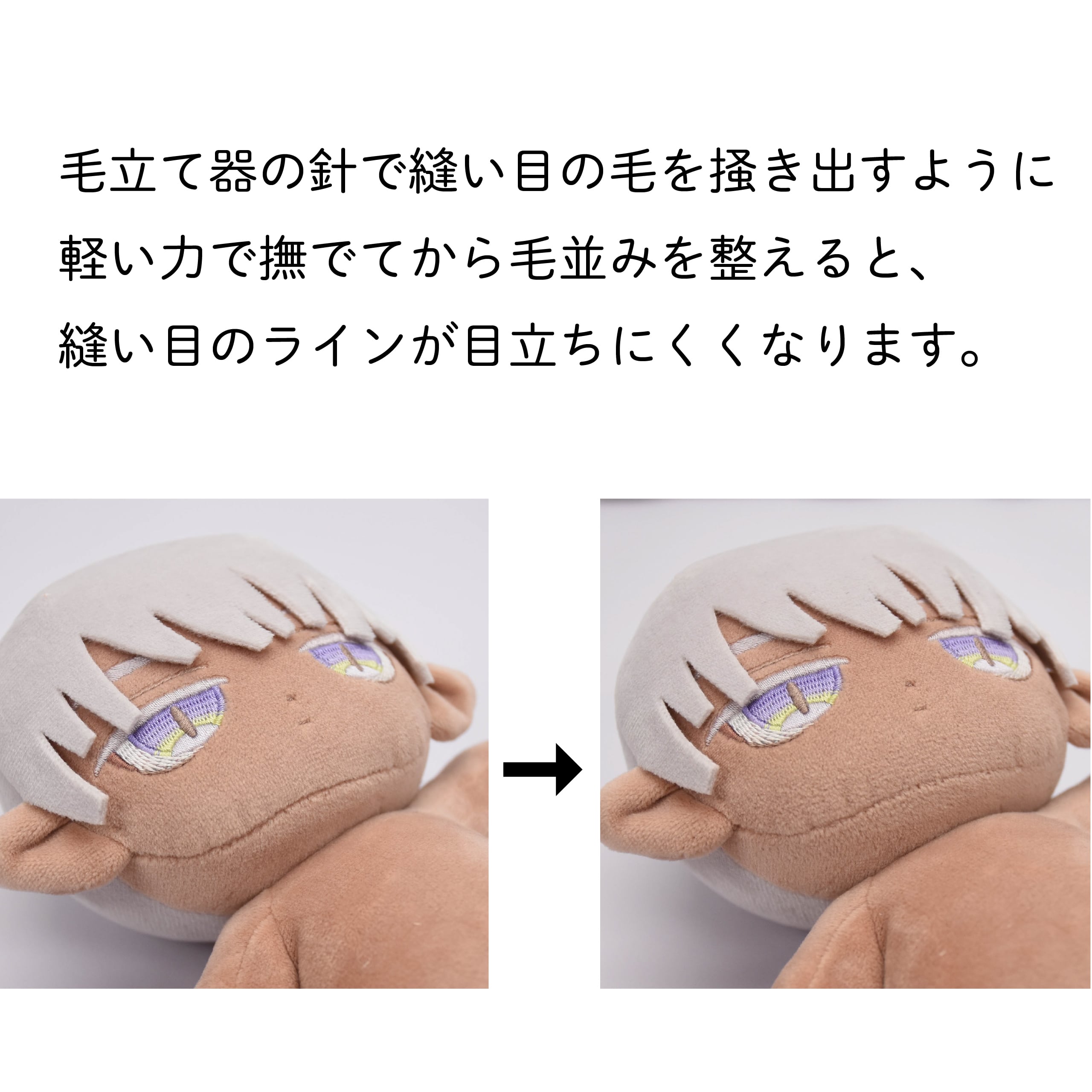 ぬいぐるみの縫い目に巻き込まれている毛を掻き出して