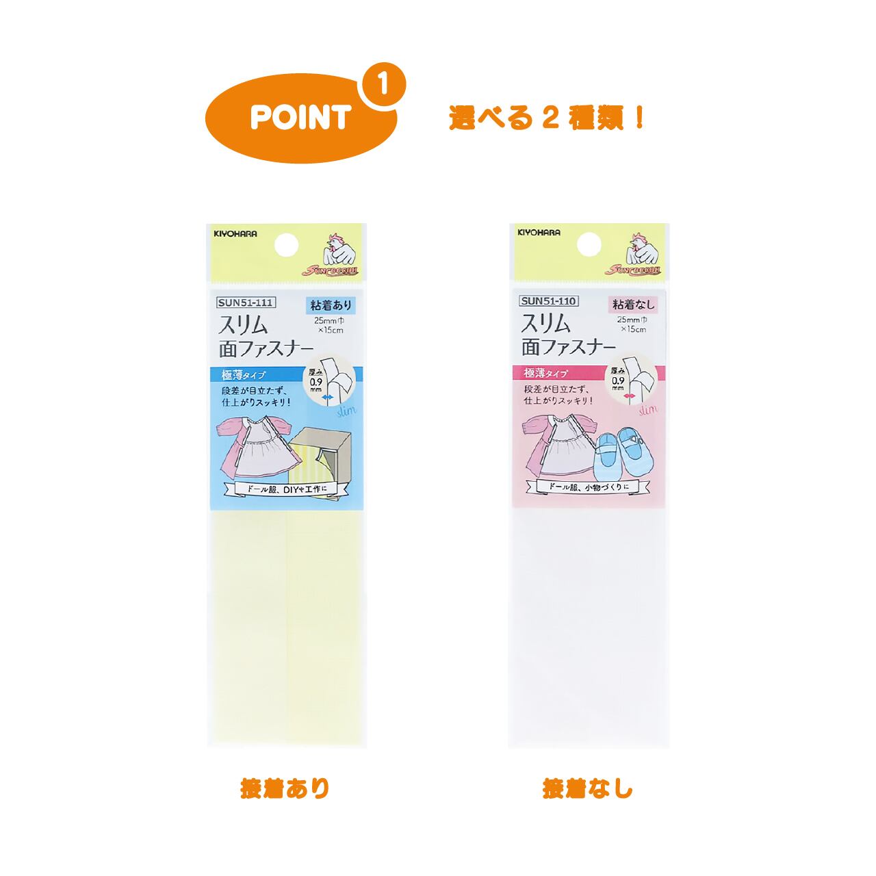 手縫い又はミシンで縫い付けて使う「粘着なし」と、裏面がシールになっている「粘着あり」の2タイプがあります。